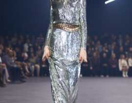 “Men would pay $200 for me, and here you are turning down a freebie. You could get a perfectly good dishwasher for that” scowls Jane Fonda in her superb Oscar-winning performance as call girl Bree Daniels, in the 1971 psychological crime Klute. Bree’s smoky voice and her lewd advice purr down the line, from a time when phone calls still went by wire, as a background for Ashish Gupta’s foxy winter show: with an invitation looking enough like a credit card that someone saw it fit to write down a note “You need to know / This is not a real credit card” as it came in the mail, a narrative of sex and money, or lack thereof, could be guessed before the first model even walked in. Although as she did, in a hooded patchwork of faux fur, lacy knickers and tight-high lipstick-slick red boots, perfect to walk on anyone so inclined, there were still a few gasps at how literally Ashish chose to perform his theme. Forget the teases, hints and innuendos of fashion past: female sexual freedom, in 2015, allows women to dress up as provocatively as they please. And with SEX spelled in large-scale pearls, and sequinned lingerie worn on its own under camouflage parkas, it’s clear that according to Ashish at least, they please to do so very much indeed. It’s the kind of look your neighbours would be shocked by – although it would be worth it, if only for you to address them as Bree does: “Tell me, Klute. Did we get you a little? Huh? Just a little bit? Us city folk? The sin, the glitter, the wickedness? Huh?”.