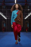 On the navy carpet, models walked with their reflection like an army approaching. The collection was patched-up, deconstructed, re-assembled in beautiful asymmetric forms, making each garment one of a kind. Mismatched collars on loose sweaters, a fur sleeve peaking out of a red coat, a half cardigan attached to a sweater, a polo collar on a tartan coat, inner and outer fabrics separated in a red duffel coat revealing the inner structure within. As for accessories, scarves found their way through the open cuts inside coat collars, while cowboy inspired hats made in collaboration with Kijima Takayuki had “kolor” letters cut-outs.