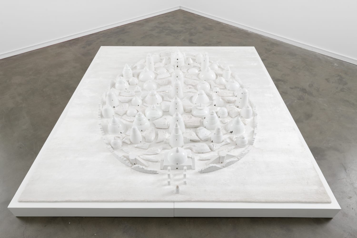Other works, much smaller , are also striking paper works of stampings with washi paper on Roman tombs when they were several times in Rome. They are samples with slight enhancements, slight changes, leaves or few words by their signature red handwriting. Those words also are sounding like omens or feelings in a particular moment. We write all day says Anne, poems, false diaries, we can keep a few or make a full diary. You could read a diary of an explorer by flashing a QR code next to the Ghost City. Those round shaped domes are the most moving part of the exhibition. Poirier made it after Anne had a dream about their late son Alain Guillaume. Mother and son gathered but then explored that city and realised it was a necropolis. No time to lose when Anne woke up, with Patrick they collected some clay in a workshop next to their Lourmarin home. Shaped in a almond form, that ceramic city is far from decorative. We are in front of our fragility, the weight of absence. They are a realistic side knowing the destruction of everything but also a idealistic part like we did in a self portrait of Patrick with two landscapes behind his head.