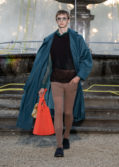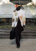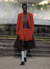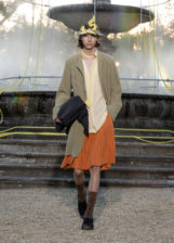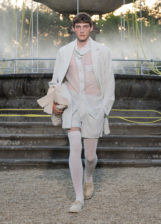 On the runway—or rather, the garden paths—models moved with an ease and grace that reflected the collection’s ethos: lightness, practicality, and a quiet confidence. There were asymmetric “painter’s” waistcoats, voluminous jackets that doubled as travel bags, and tailored pieces in linen-like textures that shimmered subtly in the evening light. Every look contained at least one pleated element, a tribute to Issey Miyake’s pioneering vision.