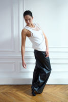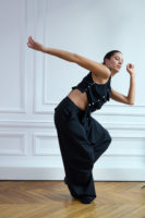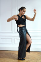 Moving through controlled gestures and sudden bursts of fluidity, the clothing responded. Faux leather skirts and trousers curved in tandem with the body, whilst layered tops in tactile fabrics allowed for a breathable yet elevated look. Structured denim provided rigidity and twisted blazers looked to be a product of the dancer’s journey. Popper fastenings covered the looks, allowing for a personalised asymmetry and original fit.