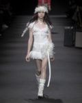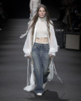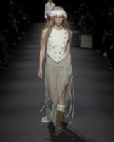 The tension is intoxicating—classic romance against the rebellion of ’70s music, dreamy silhouettes armored with boots and raw denim. There’s a softness here, never weak: corseted tops and hand-sketched tees reveal the designer’s own vulnerability, while lace-up boots and undone laces bring raw power. Fragility is honored but never fetishized, always balanced by a refusal to be sentimental.