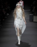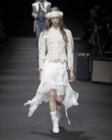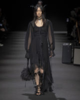 Stefano Gallici channels the legend of Ann Demeulemeester with a show that feels less like a fashion presentation and more like the opening chords of a midnight concert, where every look trembles between fragility and strength. Like the best live gigs, it’s a setlist chosen for resonance, not just spectacle—music, memory, and emotion stitched into every seam.