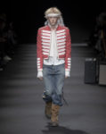 Gallici’s rock background is more than a signature: it’s a driving force. The collection is shaped by songs, posters, and poetic references—Hotel California, Morrison Hotel, the athletic romance of basketball shorts, and literary antiheroes. Delicate silk glides against sweat-stained jerseys, lace flirts with leather, and empire dresses meet repatched denim. The runway’s palette, spanning officer reds and washed whites, feels like a faded setlist scrawled in the margins of a lover’s notebook.