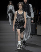Gallici’s reverence for Ann Demeulemeester is palpable. His vision collides respect for the house’s uncompromising legacy with his personal soundtrack of punk, garage, and indie. Uniformity is undone not with rebellion for its own sake, but with grace—each look an emotional performance, each stitch a lyric. Accessories nod to both sporting nostalgia and countryside tradition, feathers alongside vintage socks and headbands.