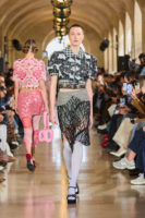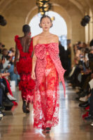 The collection opens in a dreamlike haze, a meeting point between the neon pulse of the modern city and the golden reverie of the Tang dynasty. Crimson and gold dominate, anchored by black and white tones that lend composure to Qiu’s signature exuberance. The palette feels alive with memory: each hue connecting childhood nostalgia to adult self-possession. It is a striking evolution for Qiu, who continues to explore colour as a language of identity rather than ornament.