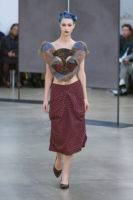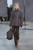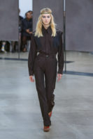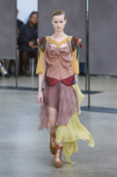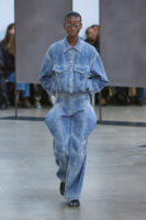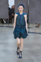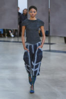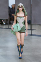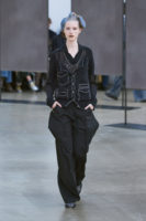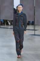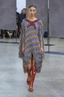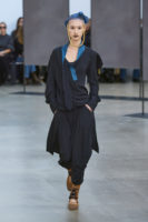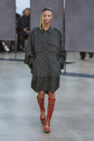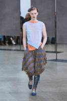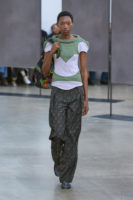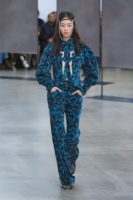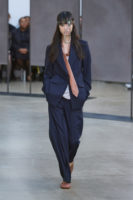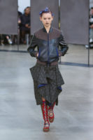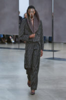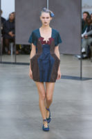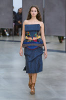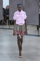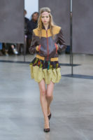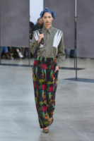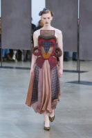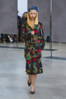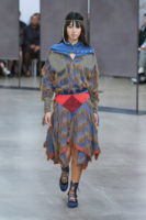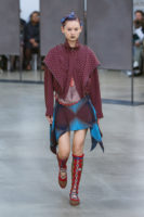 A fusion of architectural shapes, playful fabrics and classic Kiko tones, the sister duo placed the notion of women defining femininity on their own terms at the heart of their vision. The silhouettes played with distortion and balance: bodices that contorted around the torso were paired with hand-dyed, softly draped skirts, while large multifunctional collars snapped up into hoods, casting angular shadows over scarf-hem skirts. Plaid dresses and ikat argyles brought tactility, and a cotton-denim suit impersonating fleece added an unexpected sense of casual allure.