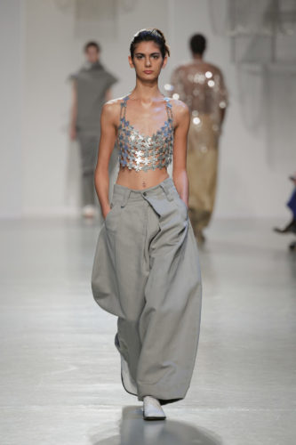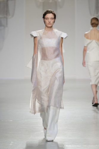 A touch of opulence, the chandelier’s reflection casts a gentle brilliance as shoulder pads emerge and dissolve, subtly reshaping the proportions of both garment and body. Instinctively, we follow the movement as hidden zippers trace new paths through pleats, turning flat surfaces into volume and volume into line. The texture navigates between woven intrecciato, sequined tulle, or laser-cut lambskin. Metallic accents break through the textile, and we are cheering for the kinetic energy. The silhouettes, dressed entirely in white, move like modern oracles through the Palais de Tokyo, inhabiting tunics, wide trousers, and long-line ensembles whose austere lines are softened by draped cotton and minimal stitching. We become witnesses to transformation. Simple squares of fabric, joined at just a few points, are reimagined as blouses, dresses, and skirts. The designer’s mastery of cut and form is visible in every careful detail, sublimating the ordinary.