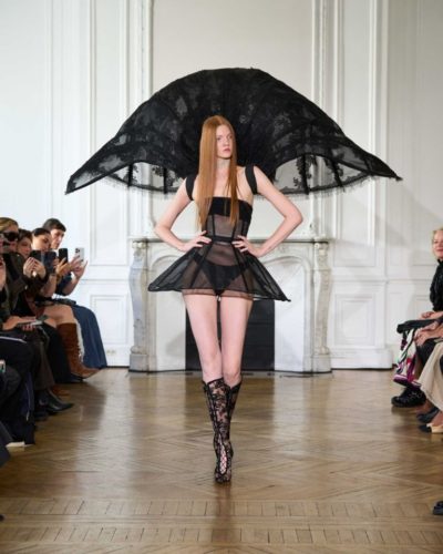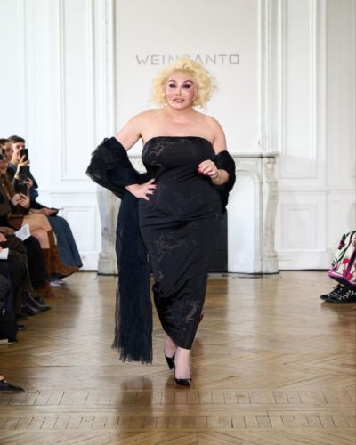 His collection, Les Irrésistibles Favorites is inspired by 17th-century courtesans : the renaissance socialites who organised parties and scandals. a celebration of womanhood through the ages. Only two high energy Women could open the show : Allanah Starr and Angèle Micaux. Their comical introduction set the tone embracing all types of women : thin plus-size models, drag queens, trans women, and women of various generations walked together. An inclusive vision that rendered audacity timeless: who cares of your past if you are the light of the party ?