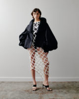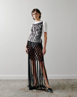 Other standout pieces include a screen-printed shirt that introduces a note of casual wearability to the otherwise elevated collection. Ruched shorts and tulip-printed trousers are styled with black mules, while silver-circle hardware lends a sense of utility. Oversized dresses and jackets sit alongside more sensual, open-crochet styles, creating a dialogue between ease and allure.