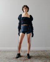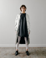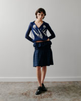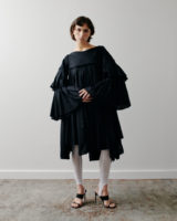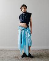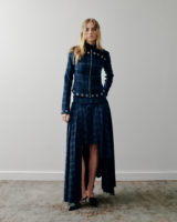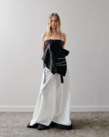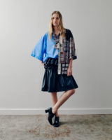 The palette remains restrained. Black and white provide clarity and contrast, punctuated by flashes of deep and electric blue. Textures build a quiet tension: crisp poplin, washed denim, and check wool meet fluid satin and translucent layers. Raw seams and unfinished hems remain visible, echoing the imperfect nature of a flower.