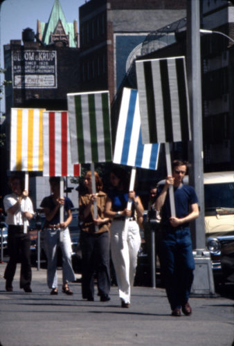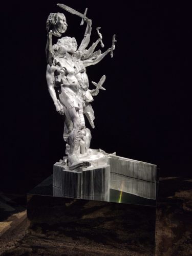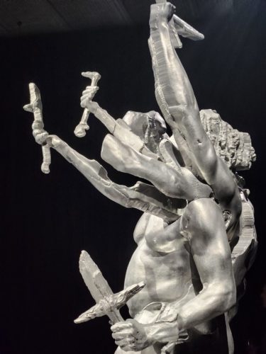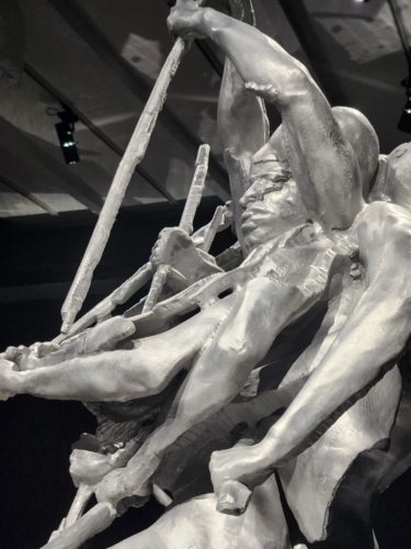 Greenberg’s causes are universal yet deeply personal. Each sculpture incarnates a biblical legend: “Saint George and the Dragon“, “Perseus Holding the Head of Medusa“, and “Saint Michael the Archangel Defeating the Demon“. Against all odds, these mythic figures are embodied by confident young Black men. Audacity and multiplicity become a living manifesto outpacing the duo. Greenberg even rejuvenates Buren’s youthful spirit, echoing his historical “Seven Ballets” of 1970s New York, when women took to the stage clutching striped boards in acts of visual protest.