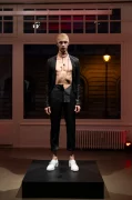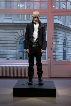 The presentation unfolds across three rooms. Models in their underwear enter, position themselves on a black platform, and begin to dress. The choreography is visible both from the street and from inside the gallery. This performance takes as its starting point the passage in the novel in which Des Esseintes, after having constructed a thebaid of extreme refinement within a sealed universe of artifice and excess, is ultimately forced to abandon it and return to reality. Sébastien Meunier stages this artistic performance as a natural extension of the decadence and artifices portrayed in the book. The models dress and undress continuously, attempting to reconstruct the looks imagined by the designer in an endless cycle where, over time, fatigue becomes apparent, makeup runs, garments wrinkle, and endurance becomes palpable.