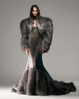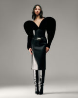 Leather and faux fur anchor the eveningwear, complemented by velvet denim and sequins. Sculptural gowns contour the body and are finished with silver and gold hardware, while appliqué florals recur across the collection, softening its harder metallic elements. Daywear leans into sharp tailoring and statement puffers, with mini skirts paired alongside knee-high stiletto boots. Archival Supergirl graphics introduce a casual note, drawing imagery from the character’s original 1959 comic book appearances. The iconic emblem appears on mohair jumpers and embellished T-shirts, translating superhero symbolism into an elevated, everyday uniform.