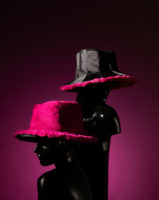 The palette is, of course, centred around black and a whole spectrum of pink—from bold fuchsia to softer, dustier tones. Jewel-trimmed berets, wool and leather shadow caps, and a reversible satin beanie that transforms into velvet with sequin feathers make up the collection, while joyful adornments such as bows, flowers, and polka dots accented the pieces.