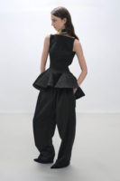 Cleanly tailored blazers cinch the waist and sculpt the body in defined silhouettes, some featuring carved circular cutouts at the back to reveal the skin. Coats are generously proportioned—oversized at the shoulders and fitted at the wrists—while trousers drape and pool over sharp stilettos. Asymmetric cuts and gathered detailing create soft yet sculptural forms, as lightweight fabrics fold and twist into shapes around the body.