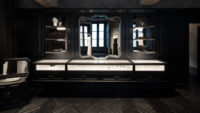 The new Milan boutique encapsulates this spirit through a design featuring stonewashed walls, black wooden floors, and deep-toned furnishings. The brand’s predominantly dark collections are illuminated by sharp white light throughout the space.