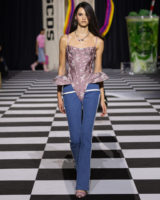 Casual moments paced the collection, emerging through college-inspired silhouettes: varsity and track jackets teamed with denim or pleated skirts in acid-washed pastels, alongside graphic tees and zip-up hoodies.