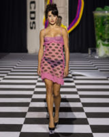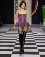 Models emerged from an oversized GCDS shopping bag, and the retrospective began. Mini dresses hugged the body, ruffled at the hem or cut out at the sides. They appeared in animal prints, florals, lace, and polka dots—bright and bold, with even the leopard spots rendered in hot pink. Longer chainmail dresses featured thigh-high slits, styled with glossy red knee-high boots. Pannier bodysuits came in pink and purple snakeskin, while airy, low-cut blouses in the same fabric floated down the runway with matching skirts.