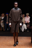 Tweed overcoats with exposed hems, matching skirts, and hats appeared with crisp shirts and V-neck sweaters layered underneath. These pieces marked a new collaboration with Harris Tweed, sourcing fabrics directly from Scotland and continuing Hodakova’s commitment to honest and traceable craftsmanship.