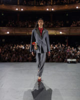 The collection itself featured subtle reinventions of personal fashion memorabilia – the argyll socks buried at the back of your sock drawer you just can’t throw away, their soles worn and frayed; coat pockets overflowing with pens, pencils, watches and necklaces because you forgot your bag; the ugly puffer jacket you’ve had since you were a teenager. Moments of familiarity and safety were recut into elevated wearable form. It also drew from its setting at the Théâtre du Châtelet by evoking Victorian theatrics: coats metamorphosed into red and purple flowing capes while dresses were held off the floor by chains attached to rings, mimicking victorian skirt-lifters designed to keep women’s dresses from trailing through the thick mud of the city streets.