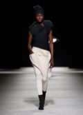 This choreography of erosion and accumulation sets the tone for a collection that continually negotiates the threshold between doing and undoing. ALLOW, one of the key series, starts from a gesture of almost ascetic simplicity: a rectangle of cloth zipped into a tube, pulled directly over the body, from which a three‑dimensional drape emerges on its own. What could read as minimalism becomes something more specific: a refusal to impose a preconceived silhouette, an insistence that form will be co‑authored by the wearer’s movements and the intrinsic memory of the textile. The fabric itself, woven from stretch yarns and washi to suggest a mineral surface, lends the garments an irregular, organic relief that feels found rather than designed.