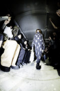 From this point of departure, the collection centers on the most fundamental human gesture: walking. A steady vibration, guiding the atmosphere forward. As a slow procession, the reversed oversized suits open the walk into a moment of self-questioning. Grounds once again uses footwear to question the relationship between the body and gravity, suggesting that even the smallest change in movement can produce a larger shift in perception. One of the season’s defining pieces is the Manus Sole. Rather than the familiar imprint of a foot, the shoe adorns the mark of a hand. The sole is sculpted to nestle the foot as a human palm – we’re all raising together.