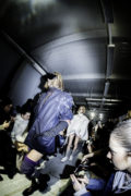 Hair becomes another defining element of the collection. Sculptural and exaggerated, it unfolds into sculptural forms, concealing the models’ faces entirely. With orientation obscured, our instinctive senses are altered. The figures become ambiguous, destabilized, and resistant to immediate recognition. A monumental cascade of hair, braided with bows, parades against the flow, on its own agenda—90% hair, 10% rebellious creature – all attitude. Around these shifting bodies, familiar uniforms are reworked. Oversized tailored blazers emerge decorated with crystal-like ornaments reminiscent of lucky charms and protective frequencies (potentially automatically recharging during every full moon). High socks, pleated navy skirts, tartan patterns, and boots evoke school uniforms, all in distorted proportions. Every day, structures remain visible: high socks, pleated navy skirts, striped button-down Vichy shirts, and tartan boots. A mad crush for the “caution” high-rise grey boots with zippers, channeling an armor energy and daring you to reach.