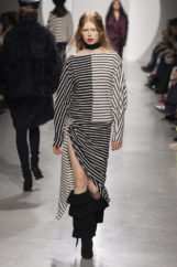 Movement remains central to the creative director’s language. Before founding her label, she trained as a dancer at the Paris Opera, an experience that continues to shape her approach to clothing. The show begins to the hypnotic rhythm of Jérôme Échenoz’s Le Chrome et le Coton, unveiling silhouettes covered in second-skin knitted bodysuits as rehearsal attire. Satin coats are embroidered with delicate floral motifs drifting fluidly over the figure. As the collection evolves, contrasts emerge. Utility surfaces through technical cotton pieces, lace-up details, and oversized aviator jackets, while silk and Calais lace introduce a sense of intimacy. Vaillant’s signature bias-cut slip dresses return in multiple variations, slipping easily between day and night. Stripes inspired by sailor uniforms, leather pieces punctuated with subtle openings, and draped jersey silhouettes evoke fragments of everyday Parisian style. The show concludes with a white silk georgette dress embroidered with flowers and edged with feathers, recalling the lightness of a tutu. A mad crush. A final gesture of movement – romance still arrives exactly on time.