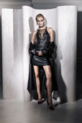 Zipped leather jumpsuits, tight corsetry, and sculpted dresses form the collection. Architectural motifs appear across lace, mimicking the wrought-iron balconies of Paris’ Haussmannian apartments. Sharp, tailored leather jackets and coats layer over evening dresses, while leather trousers mimic casual denim.