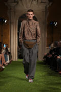 Menswear took a safer route, with long tailored coats, sharp blazers, and denim interrupted by those obscured pleats.